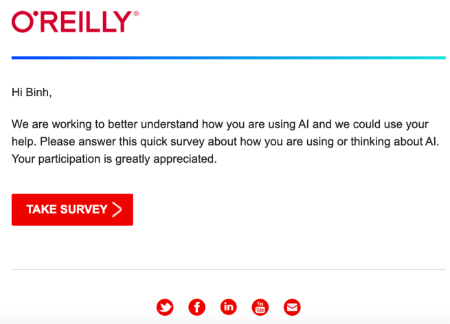 Hôm nay OReilly gửi mail, bản chất là mời làm một cái survey, và mình thấy microcopy họ làm khá tốt: